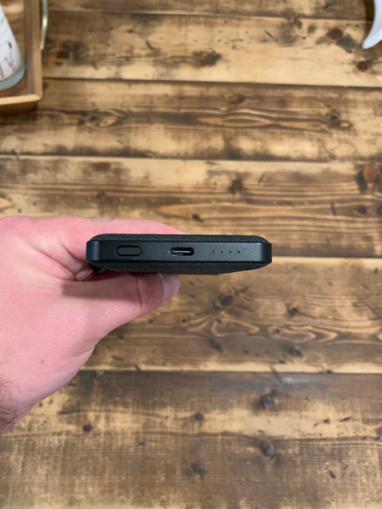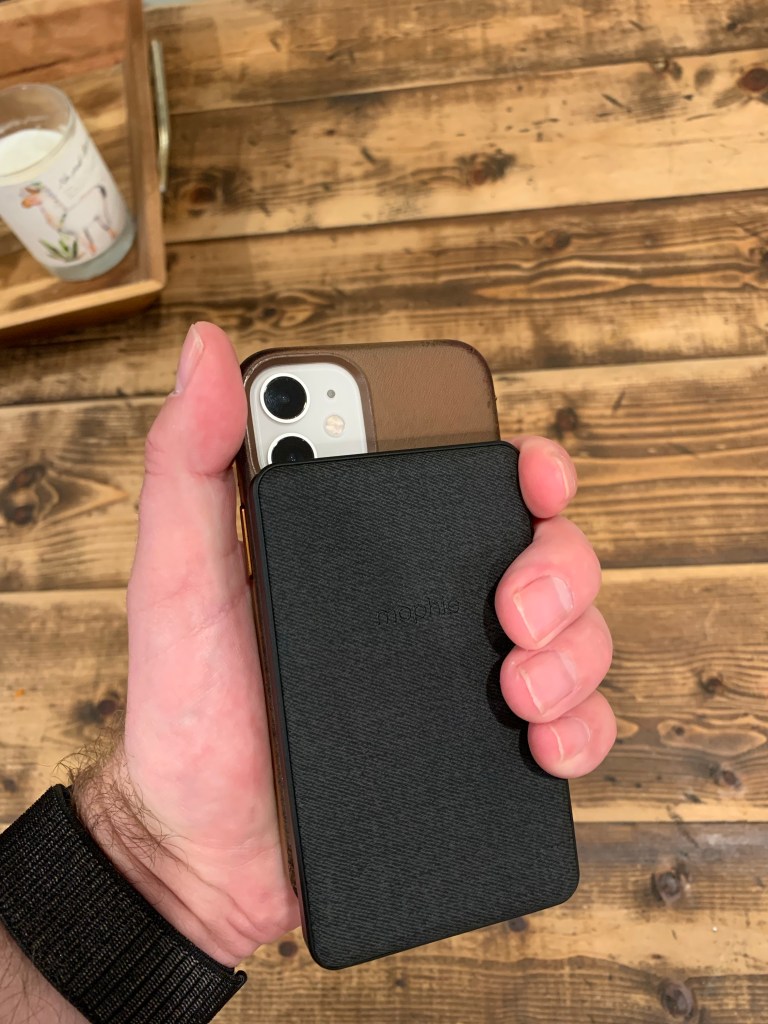 The design isn’t bad…unless you have the 12 mini. When on the 12 mini, it extends past the bottom of the phone which can be dealt with. The goofy part is, and I don’t know how this was overlooked, but it obstructs the wide-angle lens on the rear camera of the iPhone 12 mini. On my wife’s 12 Pro Max, it was fine but on the mini, you will have to remove it to use the default camera. It has a fabric-like texture and feels good in the hand. Obviously this will add some weight to your setup but for the extra battery, it was well worth it.
